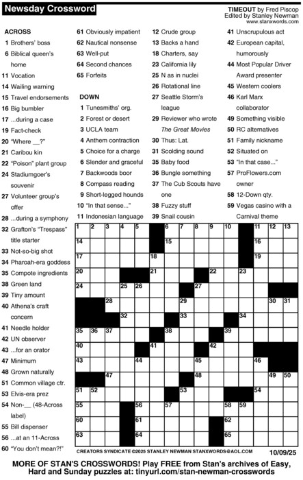 Because free access to the content of Newsday.com is available only to Newsday subscribers and customers of Cablevision (Newsday’s owner), many thousands of puzzle fans, spanning six continents, get the Newsday Crossword free every day right here at Stan’s Crossword Land.