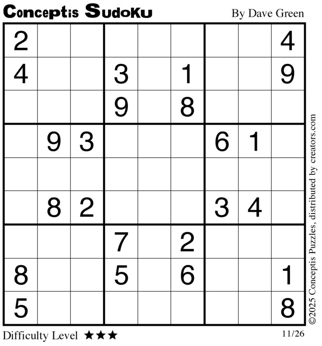 Each puzzle consists of a 9x9 grid containing given clues in various places. The object is to fill all empty squares so that the numbers 1 to 9 appear exactly once in each row, column and 3x3 box.